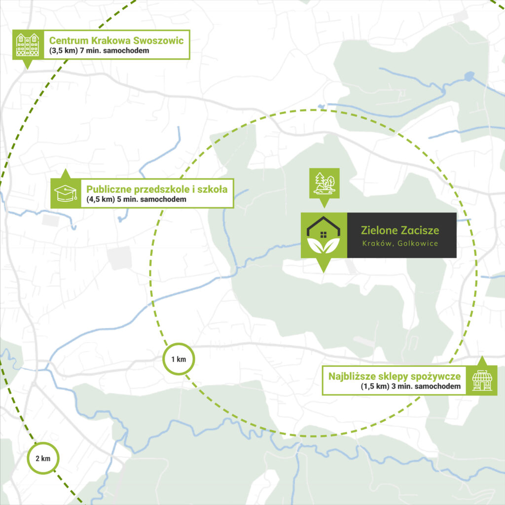 Nazwa inwestycji – Zielone Zacisze – doskonale określa charakter lokalizacji, w której się ona znajduje. Zielone Zacisze w Golkowicach – dosłownie 500m od granicy Krakowa – to niezwykle spokojna, pełna naturalnego uroku okolica, sprzyjająca odpoczynkowi od miejskiego zgiełku. Nie brakuje tutaj terenów idealnych na spacery lub wycieczki rowerowe. Blisko również do miejskich wygód – np. do centrum Krakowa Swoszowic, gdzie znajdują się liczne sklepy spożywcze, punkty usługowe, centra sportowe oraz placówki edukacyjno-opiekuńcze.
